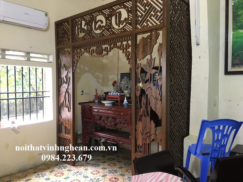 Nội thất Vinh Nghệ An - Vách ngăn phòng thờ CNC là tấm ngăn cách phòng thờ với không gian xung quanh, được khắc cắt trên máy CNC khắc gỗ, cho đường nét khắc cắt tinh xảo và đẹp mắt, đảm bảo tính thẩm mỹ cho không gian sống hiện đại của bạn.